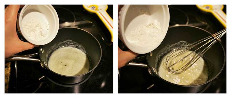 Melt the butter over medium-to-low heat, and slowly whisk in the flour. This mixture will thicken the sauce (adding flour directly to the milk and/or sauce will make it clumpy).