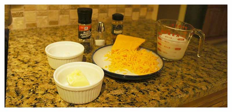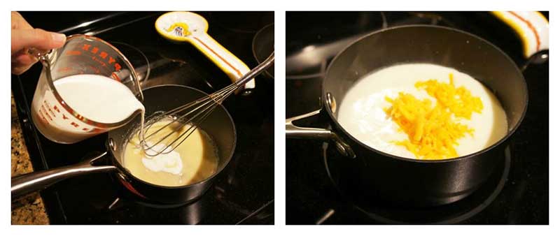Pour the milk into the butter mixture, whisking continuously. Once all the milk has been added, bring to a boil over medium heat. Stir frequently to keep the milk from burning. Then add the cheddar cheese, salt, black pepper, and cayenne pepper to the sauce. Turn the heat to low.