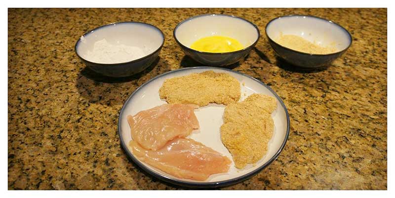 Next, dredge the chicken through the flour, eggs, and bread crumbs (in that order).