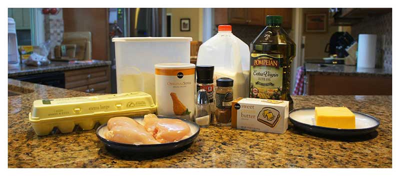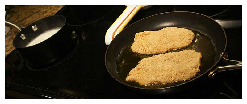 While your cheese sauce is bubbling warmly on the stove, heat up the oil to fry your chicken. Use enough oil to completely surround the chicken, roughly ¼ inch.