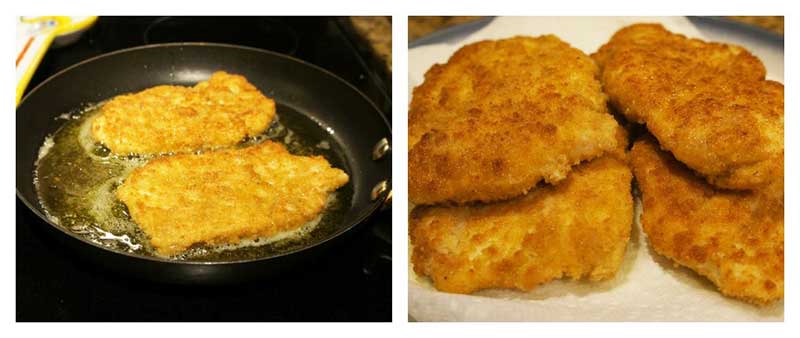 Cook the chicken on low-to-medium heat for approximately four minutes on each side. The low heat seating will give you a nice golden brown; if the oil is too hot, the bread crumb coating will burn. Place your chicken on paper towels to drain after frying.