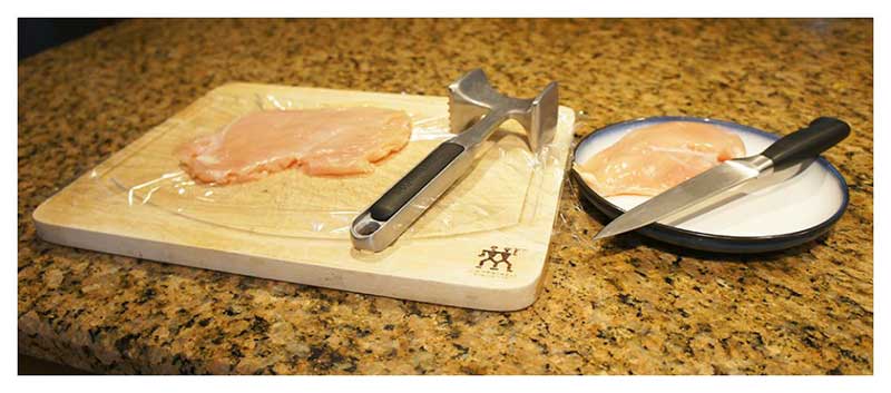First, take your chicken and give it a couple of good whacks. You’ll want to use a meat mallet to get the chicken to a consistent thickness of approximately ½ inch. Be careful you don’t go too thin, or the chicken will start to separate. I can sometimes find thinly sliced chicken breasts at the grocery store, which can help aid this process. Once you’ve flattened your chicken, you may want to cut the breast in half so it’s more manageable. Also, I recommend putting plastic wrap above and below the chicken to prevent any flying chicken.