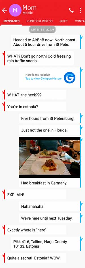 As residents of St. Petersburg, Florida, we couldn’t resist pouncing on this. We could tell people we were staying just a few hours outside of St. Pete, without clarifying whether that St. Pete was in Russia or Florida. It’s a narrative we stuck with for weeks. When grilled by friends about our holiday travel plans, my husband and I would nonchalantly say, “Oh, we just rented an AirBnB about five hours from St. Pete.” When pressed further, we’d furl our brows and say, “Somewhere on the north coast. Right on the water. Hope it’s a little cooler up there.” We continued this deception up until the moment we arrived at our AirBnB in Tallinn, the point at which I sent my mom a Glympse to let her know where we were.