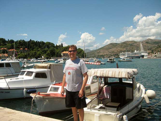 First we wandered down the hill away from the city walls, where we ran into a couple who thought we were locals (apparently my husband’s Louisville Cardinals shirt wasn’t a dead give-away), but we were able to provide them directions nonetheless…to Old Town. From there, we made our way through the business district, where we stopped at one of the small restaurants catering to the folks in suits. We were a little out of our element but managed to order some type of sausage sandwich. Then we started following the signs to “Lapad.” We wandered through some beautiful beachfront neighborhoods, picked out the house we were going to buy when we won the lottery, and before long we stumbled upon Lapad Beach.